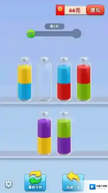3、通过灵活的操作来将同种液体倒入同一瓶子中,全部装好后即可过关获得奖励。