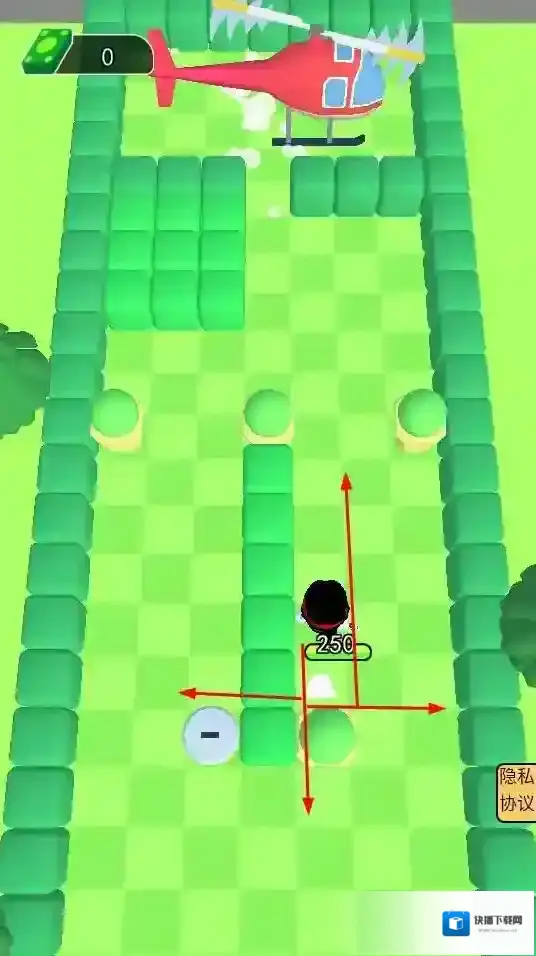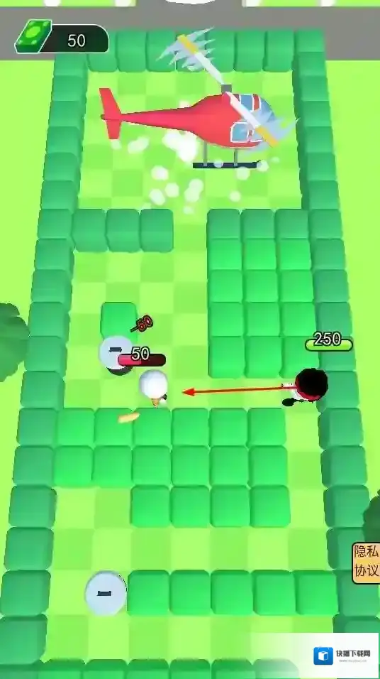 2、游戏设有关卡,玩家操控角色在绿色方块组成的迷宫场景中前进,与白色敌人战斗,向关卡终点的直升机处推进。