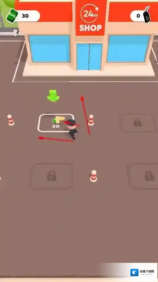 1、玩家操控角色在场景中移动,拾取地上类似钞票的资源,如从标有“30”“45”的区域收集,增加游戏内货币数量。