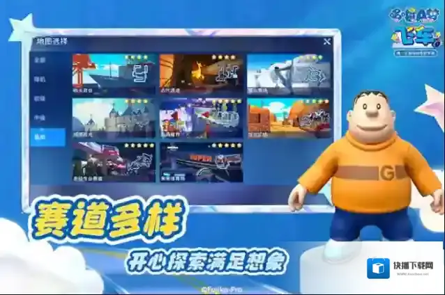 3、兼具奇幻与趣味的赛道,多种地图随意选择。太空旅行、未来都市等奇幻地图,大雄家的后院等经典场景,玩家可驾驶赛车一路狂漂,领略不同的赛道风光。