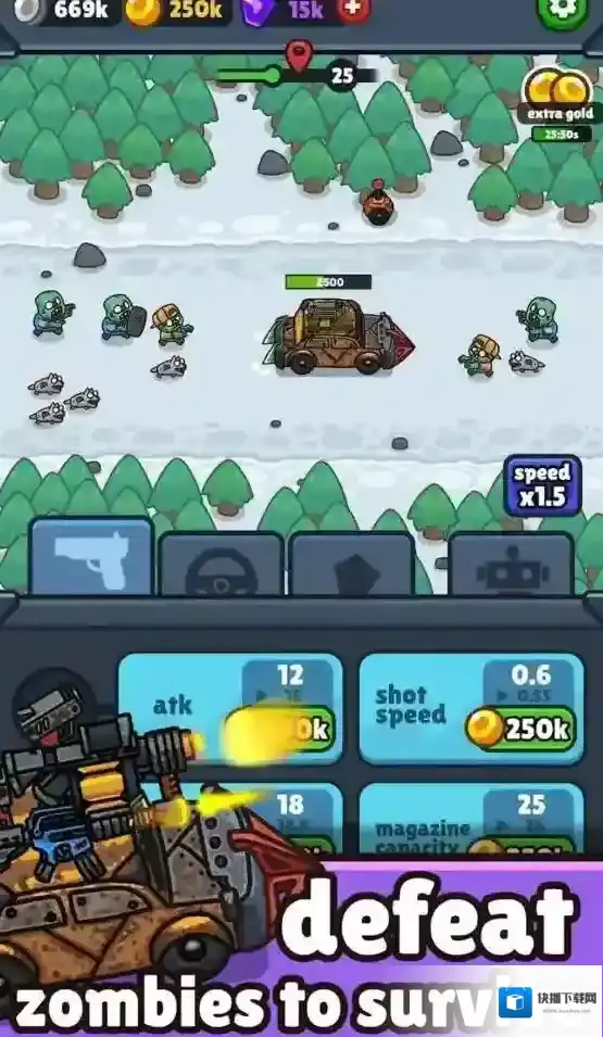2、进入关卡后车辆会自动攻击僵尸,击败僵尸可以获得丰富奖励。