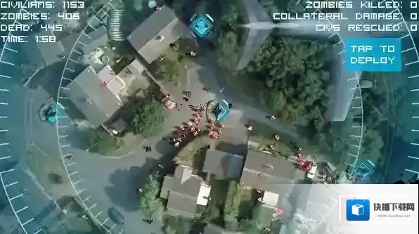 游戏打开就是这样一幅卫星地图,不像Osmos一样你控制其中一个人或者僵尸慢慢成长,你无能为力。身为旁观的上帝,世上万物都是自己的子民,他可以看着人类为了温饱屠杀牲畜,如今也不会介入僵尸和人类的战争。此游戏用了google的卫星地图,房屋上的瓦片,汽车,树木等物体都清晰可见。应用中没有人类穿红色的衣服,红色成了区分人类和僵尸的标志。