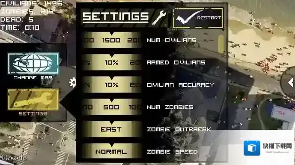 打开游戏右上角的设置按钮,参数中可以对平民和僵尸分别设置,平民的数量、平民武装的百分比、僵尸的数量、僵尸移动的速度和僵尸出现的位置等等一系列参数。